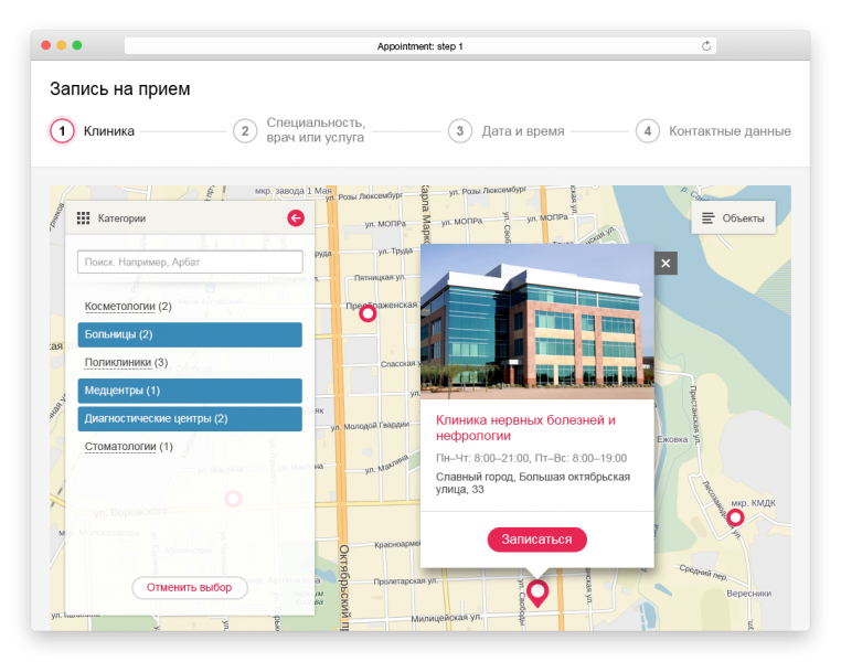 - Выбор клиники на интерактивной карте филиалов